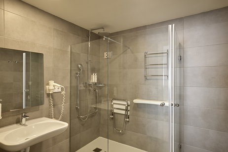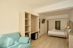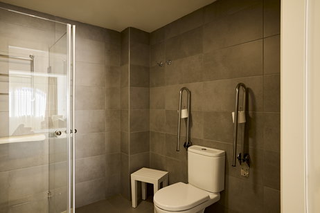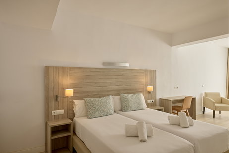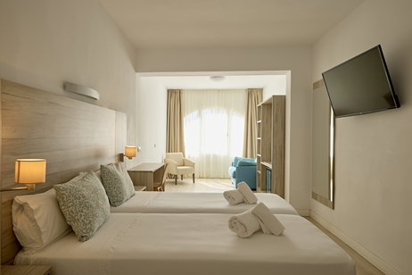 Room without balcony featuring 2 single beds and a sofa. Includes air conditioning, soundproof walls, and a private bathroom with walk-in shower and hairdryer. Comfort and quiet for your stay.