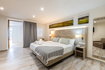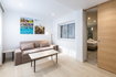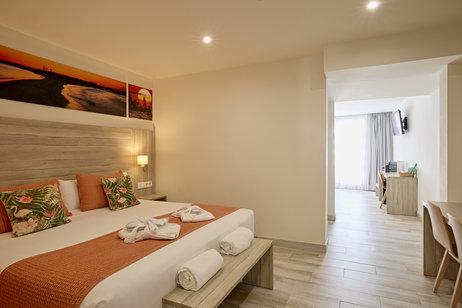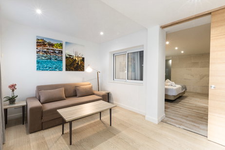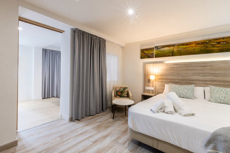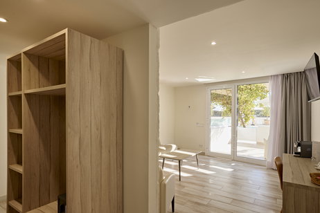 Suite with living room, bathroom with walk-in shower, air conditioning, flat-screen TV with satellite channels, soundproof walls, king-size bed, sofa bed, and garden views.